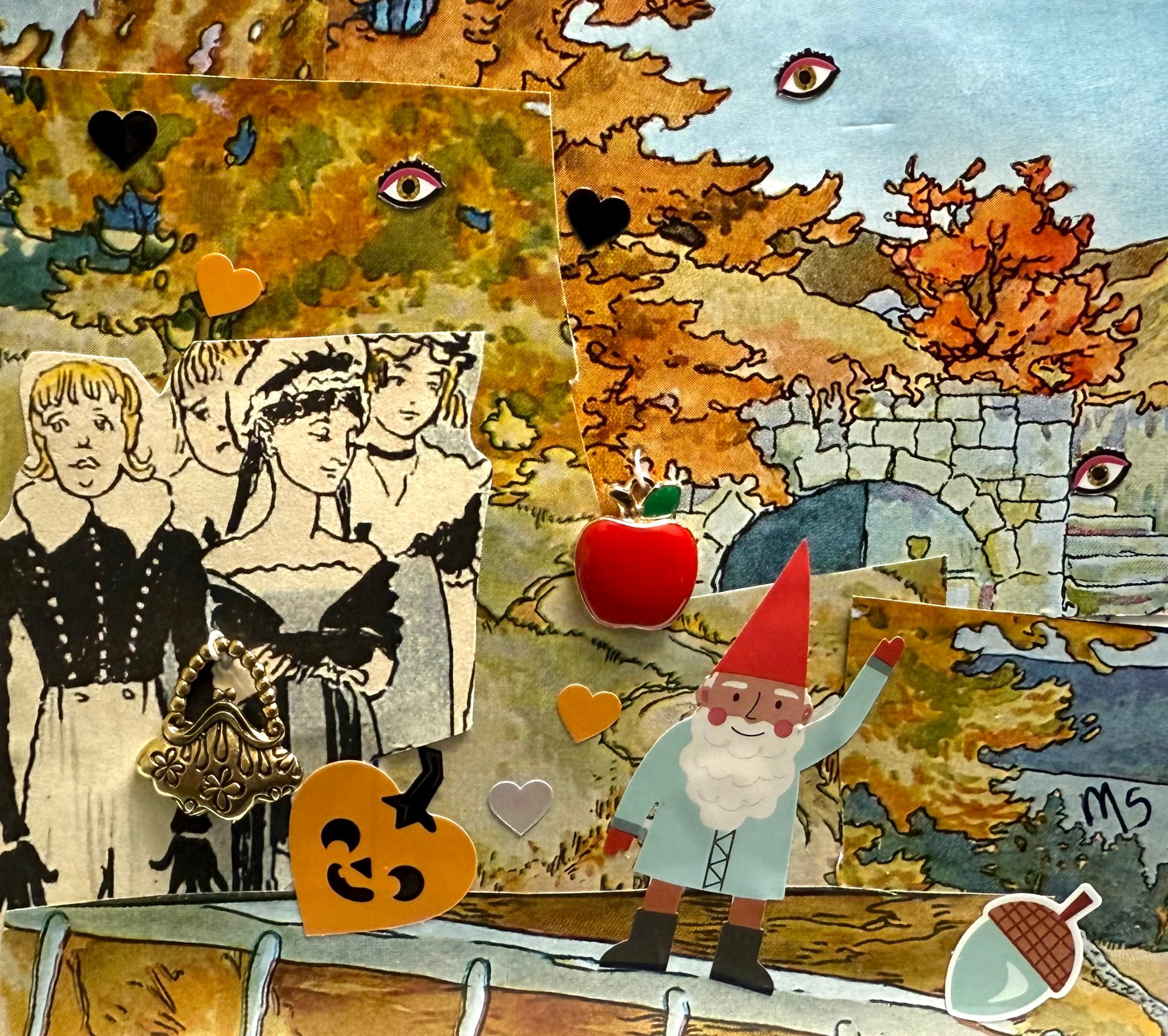 Martha Savage, an artist from New Haven, Connecticut, creates unique, signed art at an affordable price. This one-of-a-kind mixed media collage card is made on an actual timecard. It’s a 4.5”X4” blank, blank inside is constructed with pH-neutral glue and sewn with linen thread. The card is collectible, mailable, giftable, and frameable. It features fresh, witty illustrations from vintage and antique children’s books, along with trinkets and stickers.