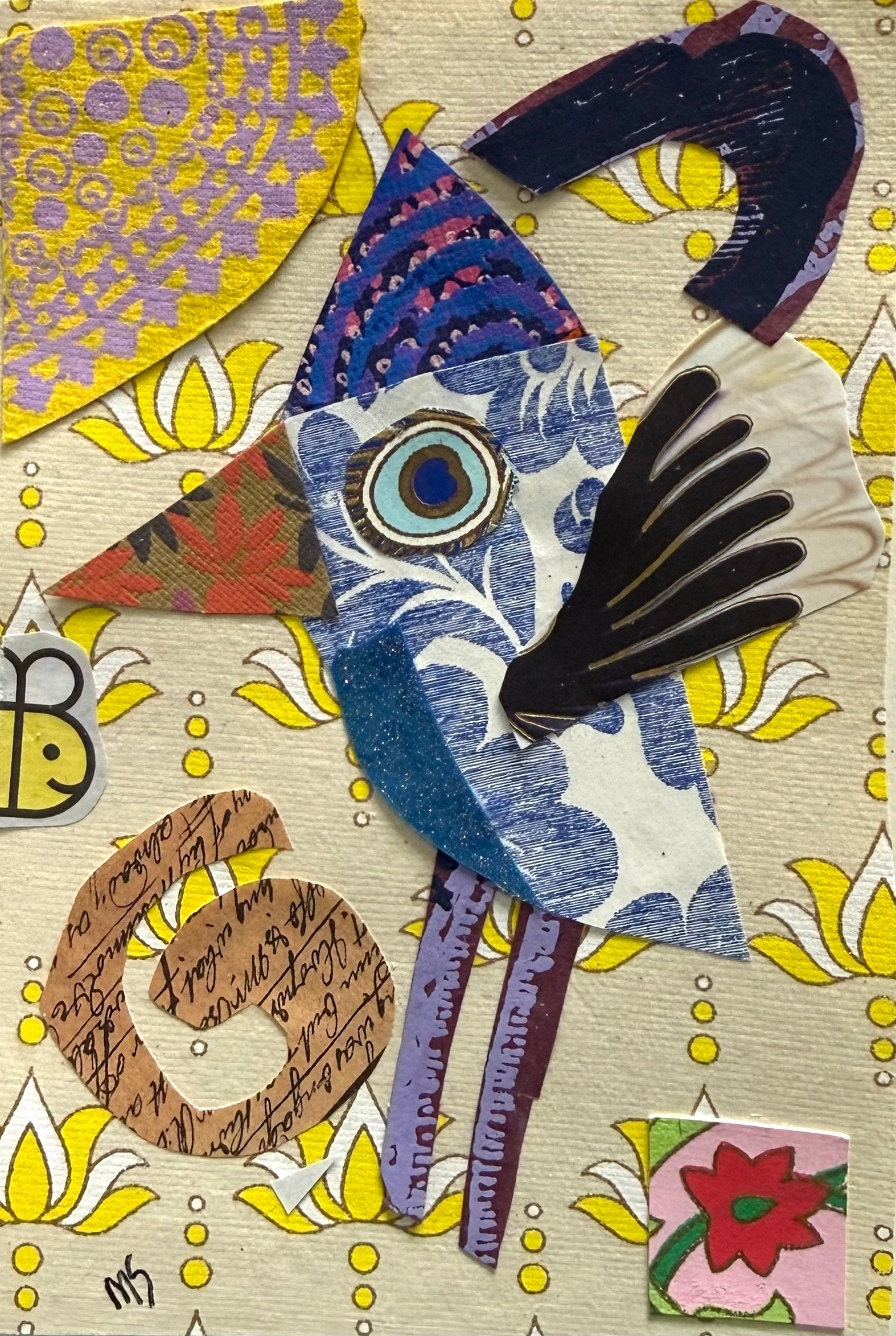 This one-of-a-kind 4X6” collage is a unique blend of printed and hand-painted papers imported from India and other sources. Each carefully selected paper is meticulously composed into the final collage, which is presented in a simple black frame under glass. Some of the papers used in this collage are Shizen papers, entirely made from post-consumer waste and produced using a pollution-free paper-making process. I source paper from various places and ensure to use all the scraps, thereby minimizing waste.