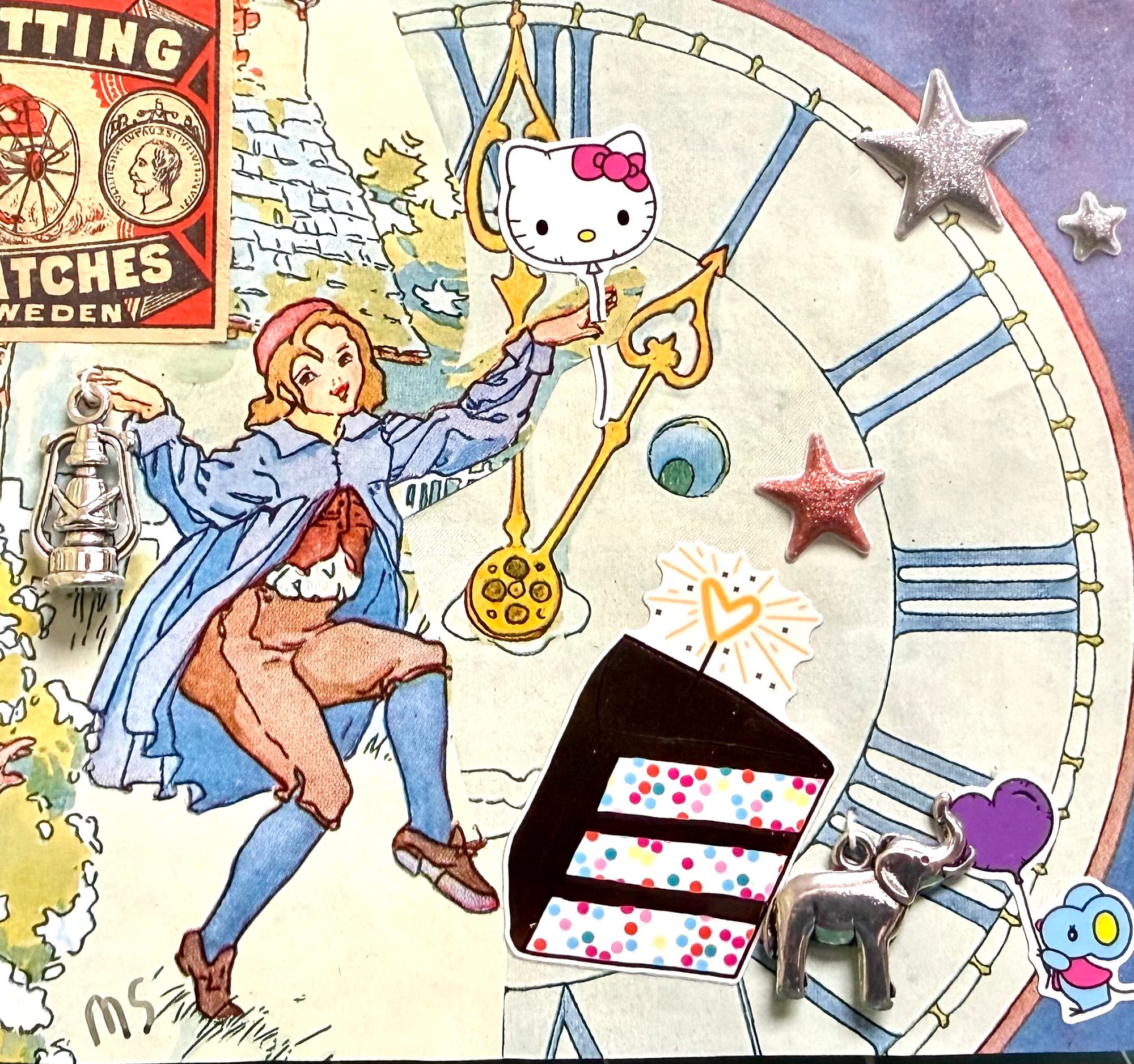 Martha Savage, an artist from New Haven, Connecticut, crafts unique, signed art pieces at an affordable price. This card collage, measuring 4.5 x 4 inches, is a delightful creation made from 100-year-old children’s book illustrations and decorative papers. Some of these papers have been artistically painted and printed on. Additionally, the collage incorporates mixed media materials, adding to its visual appeal. This piece is perfect for anyone's birthday.