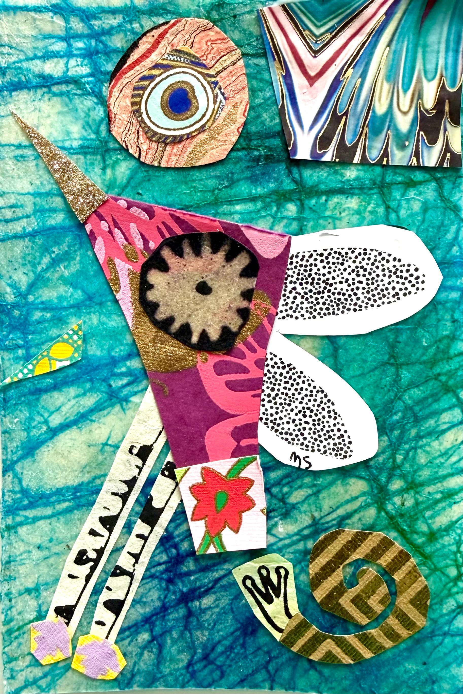 This one-of-a-kind 4X6” collage is a unique blend of printed and hand-painted papers imported from India and other sources. Each carefully selected paper is meticulously composed into the final collage, which is presented in a simple black frame under glass. Some of the papers used in this collage are Shizen papers, entirely made from post-consumer waste and produced using a pollution-free paper-making process. I source paper from various places and ensure to use all the scraps, thereby minimizing waste.